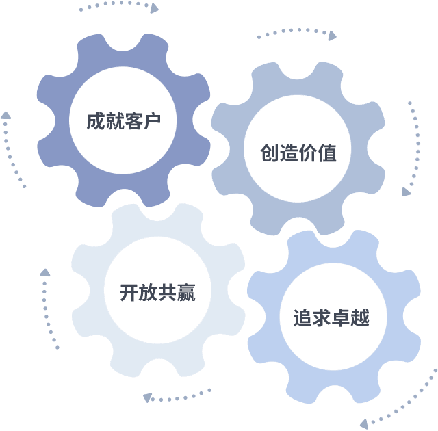 成就客户是一切决策的出发点,,创造价值是衡量所有工作的标准,,,,追求卓越是我们做事做人的态度,,,开放共赢是我们的格局也是最终的结果。。价值观的齿轮环环相扣,,,推动着组织里的每个人不断向前。。